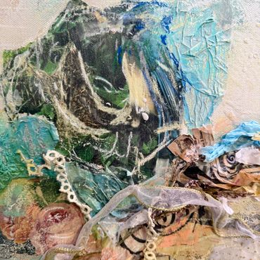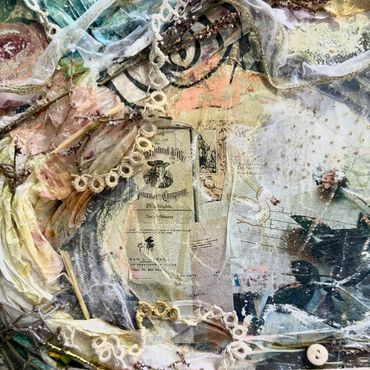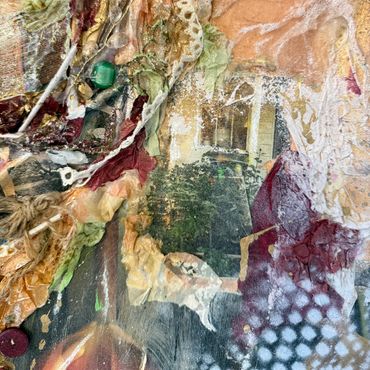 India ink & alcohol ink, spray paint, chalk pastel, tissue paper & fabrics, found objects